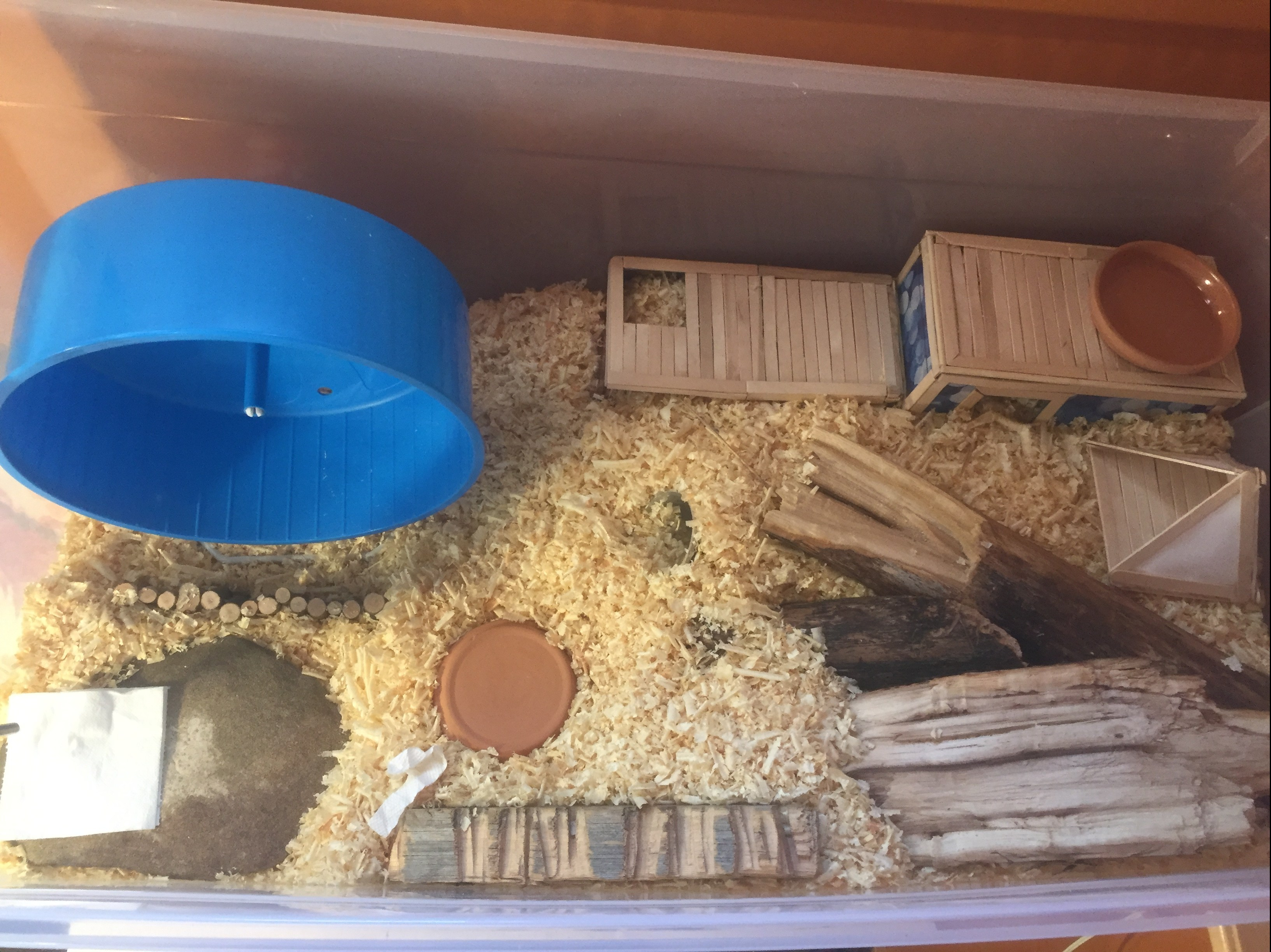 - After it was time for the hides. I used my Luxury Hamster Home (right, July 14th), burrowing house/platform (left) and then the Barn Facade hidey, which is underground with a Pringles can tube leading down to it.