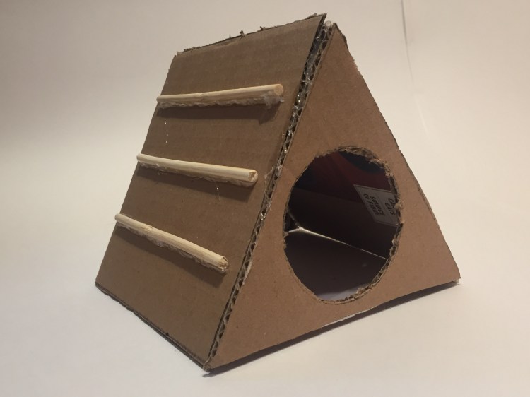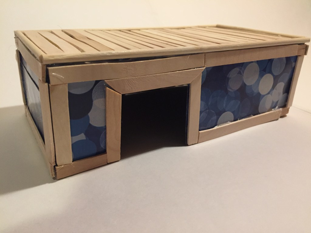 This DIY is probably Beanie’s favorite hidey. She absolutely loves it, and choses it as her nest whenever it’s in her cage! It was designed especially to fit her tank. It’s stuck together with hot glue, and is made primarily of plywood. I love the aesthetic, but however this is quite a large DIY, measuring 11 inches in length.