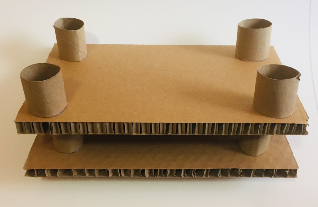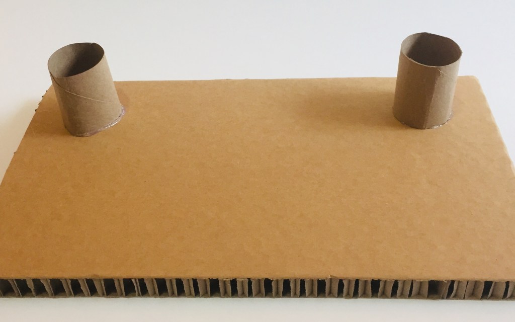 - Glue the four toilet paper roll pieces in the corners of the cardboard piece, creating four legs.